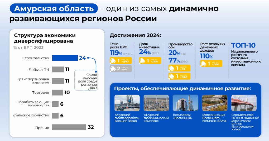 «Амурская область – один из самых динамично развивающихся регионов Дальнего Востока. В 2024 году рост валового регионального продукта области составил 119% к 2023 году. Регион – лидер по этому показателю в ДФО и второй по стране. Приамурье входит в топ-10 Национального рейтинга состояния инвестиционного климата, в 2024 году рост инвестиций составил 24% – Амурская область по вложениям инвесторов – абсолютный лидер среди регионов Дальнего Востока», – рассказали эксперты Востокгосплана.