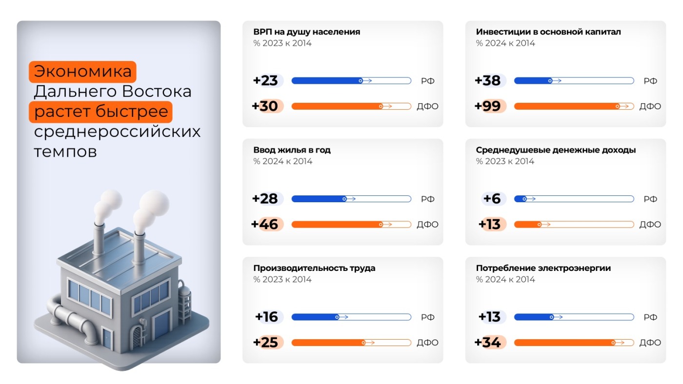«Сегодня каждый десятый рубль в России вкладывается на Дальнем Востоке. Мы обгоняем среднероссийские темпы по росту валового регионального продукта, ввода жилья, инвестиций в основной капитал, и, наконец, среднедушевых денежных доходов населения. Для нас этот показатель – ключевой стимул для привлечения и удержания людей», – сказал директор Востокгосплана, отметив также рост производительности труда (пусть и с очень низкой базы) и потребления энергии в ДФО.