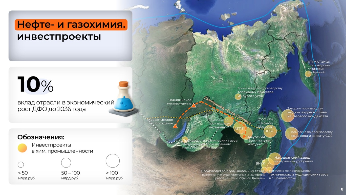 Природную ренту необходимо реинвестировать в глубокую переработку. Пример такого подхода – крупнейшие проекты, реализующиеся в Амурской области: газоперерабатывающий завод и газохимический комплекс в городе Свободном. Есть инвестпроекты в химической промышленности и в других регионах. В целом вклад нефтегазохимической отрасли в экономический рост ДФО до 2036 года оценивается в 10%.