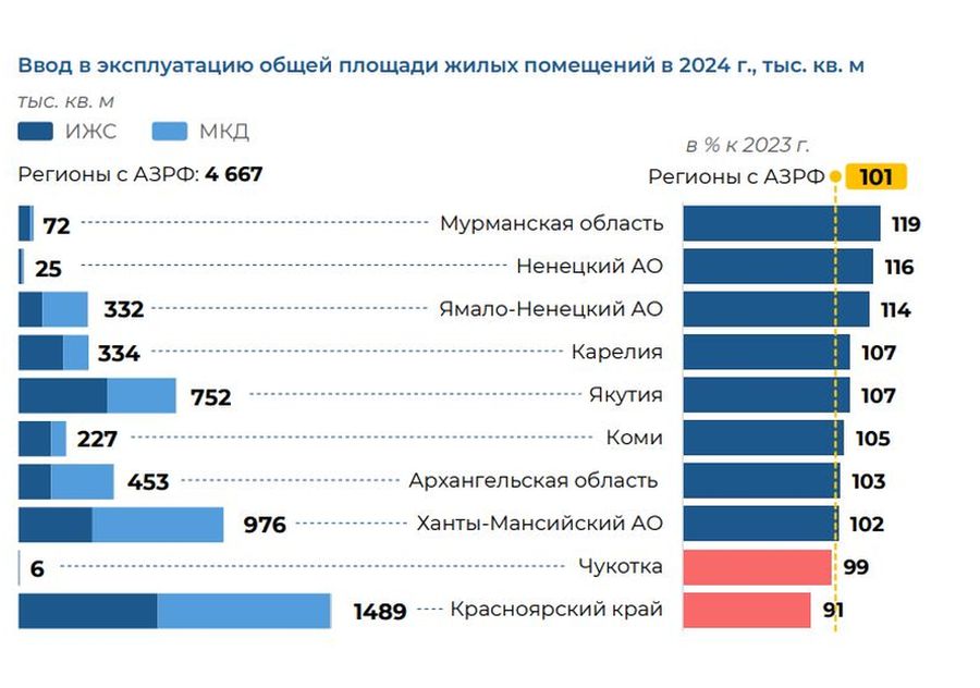 «Сложившийся за 2020-2024 годы среднегодовой абсолютный прирост обеспеченности жильем в регионах с АЗРФ (0,4 кв. м на человека) недостаточен для достижения целевого показателя к 2030-му. С учетом динамики признания жилья аварийным необходимо обеспечить ежегодный ввод около 1 кв. м жилой площади на человека. В Архангельской области, республиках Карелии и Коми при сохранении текущих темпов роста показателя, уровень обеспеченность жильем к 2030 году будет выше общероссийской цели на 4-6 кв. м на человека», – подчеркнули в Востокгосплане.