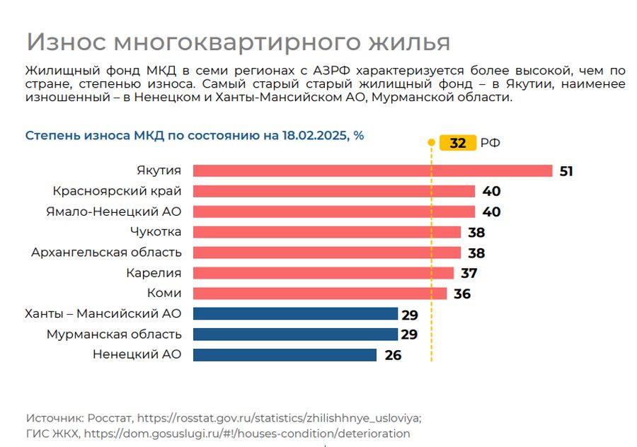 «В семи регионах, территория которых частично или полностью входит в состав АЗРФ, жилищный фонд в 2024 году характеризовался более высокой, чем по стране, степенью износа МКД – от 36% до 51% (РФ – 32%)», – подчеркивают эксперты Востокгосплана.