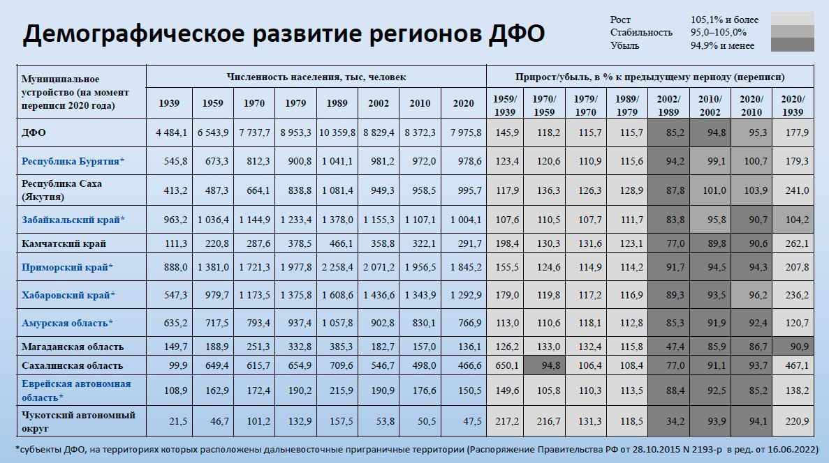 Демографические процессы имеют длительный период формирования и внутреннюю историческую обусловленность. Например, согласно данным последней всероссийской переписи населения, дальневосточные территории к 2020 году находились на разных стадиях жизненного цикла. Это подтверждается исследованиями Востокгосплана, охватившими межпереписные периоды с 1939 по 2020 года с учетом современных границ и всех административных изменений на муниципальном уровне.