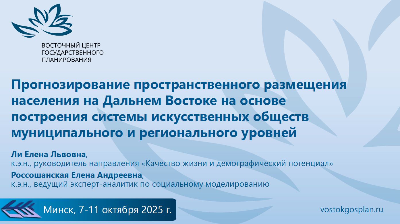 В рамках дискуссионной панели «Цифровая экономика и моделирование искусственных сообществ» руководитель направления «Качество жизни и демографический потенциал» ФАНУ «Востокгосплан» Елена Ли и ведущий эксперт-аналитик по социальному моделированию Елена Россошанская представили результаты прогнозирования численности населения по муниципалитетам Дальневосточного федерального округа на основе имитационного моделирования.