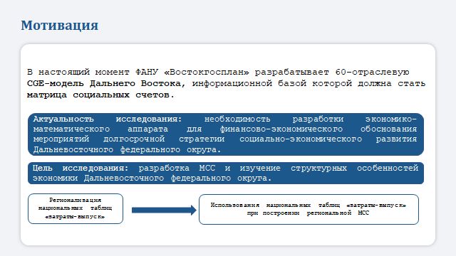 Наработки ФАНУ «Востокгосплан» представила ведущий аналитик направления «Макроэкономические исследования и прогнозирование» Полина Перетятько. В настоящее время эксперты разрабатывают вычислимую модель общего равновесия ДФО по 60 отраслям экономики. Традиционной информационной базой подобных моделей служит матрица социальных счетов.