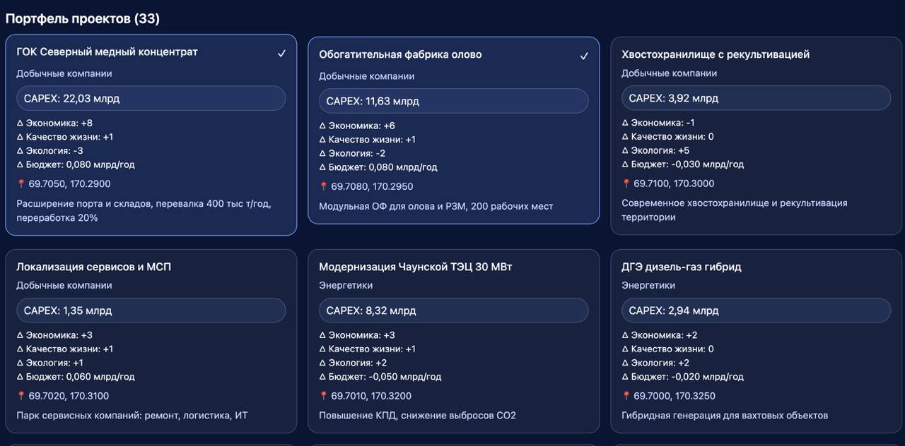 «Цель игры – совместно в группах разработать и защитить план развития Певека до 2035 года. Необходимо, чтобы совокупный бюджет города оставался сбалансированным, а общий объем капитальных затрат не превысил 50 миллиардов рублей за весь период планирования», – объяснила Мария Никишова.